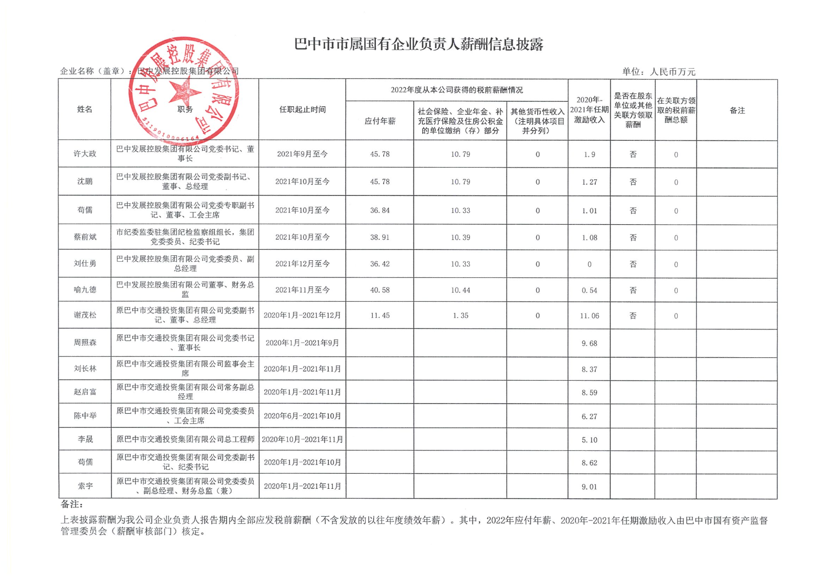 巴中市市屬國(guó)有企業(yè)負(fù)責(zé)人薪酬信息披露